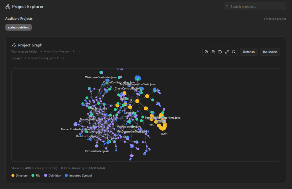 gkg index --stats 2025-10-08T06:42:38.715542Z INFO Created data directory: /home/y-imai/.gkg 2025-10-08T06:42:38.716891Z INFO Discovering workspace: /home/y-imai/repos/spring-petclinic 2025-10-08T06:42:38.716938Z INFO Cleaning up workspace: /home/y-imai/repos/spring-petclinic 2025-10-08T06:42:38.716945Z INFO Indexing repositories in workspace: /home/y-imai/repos/spring-petclinic 2025-10-08T06:42:38.721854Z INFO Finished indexing repositories in workspace: /home/y-imai/repos/spring-petclinic, statistics: WorkspaceFolderStatistics { file_count: 153, repo_count: 1 } 2025-10-08T06:42:38.721954Z INFO Found 1 repositories with 153 files in workspace 2025-10-08T06:42:38.724090Z INFO Starting repository indexing for: spring-petclinic 2025-10-08T06:42:38.735673Z INFO Processing 43 files 2025-10-08T06:42:38.735725Z INFO Using 8 CPU workers (spawn_blocking) 2025-10-08T06:42:38.751849Z INFO 🔄 Progress: 11% (5/43 files) - 310.8 files/sec - 5 processed, 0 skipped, 0 errors 2025-10-08T06:42:38.754855Z INFO 🔄 Progress: 23% (10/43 files) - 524.7 files/sec - 10 processed, 0 skipped, 0 errors <中略> 2025-10-08T06:42:39.211178Z INFO ✅ Workspace indexing completed in 0.49 seconds 2025-10-08T06:42:39.211220Z INFO Indexing Summary: 2025-10-08T06:42:39.211254Z INFO - Total Projects: 1 2025-10-08T06:42:39.211260Z INFO - Total Files: 43 2025-10-08T06:42:39.211264Z INFO - Total Definitions: 213 2025-10-08T06:42:39.211268Z INFO - Total Imported Symbols: 430 2025-10-08T06:42:39.211271Z INFO - Total Definition Relationships: 448 2025-10-08T06:42:39.211276Z INFO - Total Imported Symbol Relationships: 0 2025-10-08T06:42:39.211279Z INFO Project Timing: 2025-10-08T06:42:39.211283Z INFO - /home/y-imai/repos/spring-petclinic: 0.49s (43 files, 213 definitions, 430 imported symbols, 448 def relationships, 0 imp relationships) 2025-10-08T06:42:39.211289Z INFO Language Breakdown: 2025-10-08T06:42:39.211292Z INFO - Java: 43 files, 213 definitions