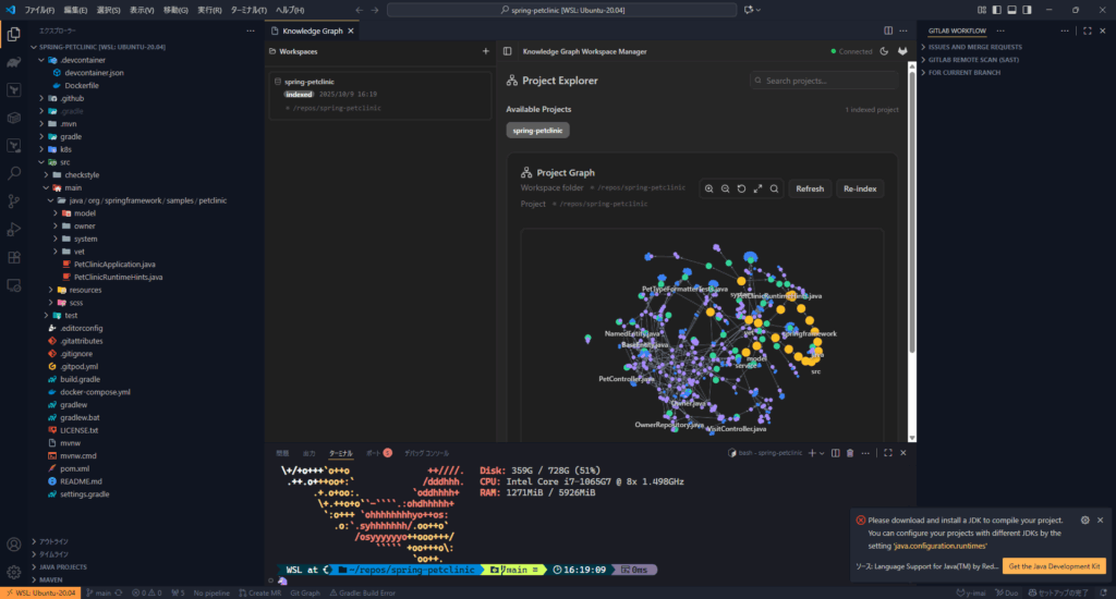 対象リポジトリをクローンしたディレクトリで VS Code を起動します。その後、コマンドパレットでShow Gitlab Knowledge Graph