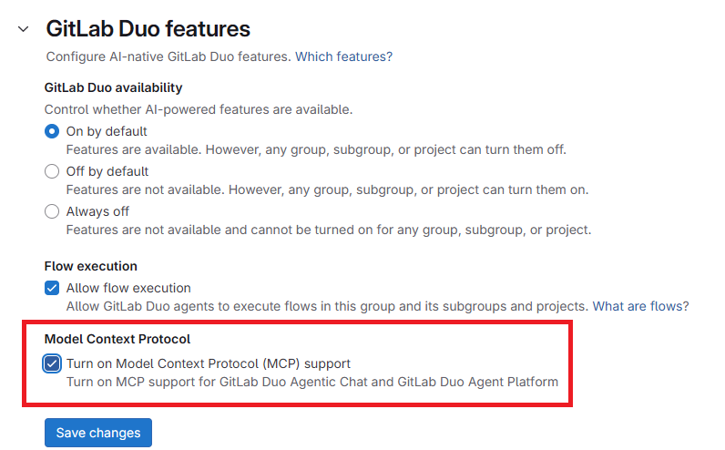 また、対象リポジトリのプロジェクトのトップグループにて、MCP を有効にします。