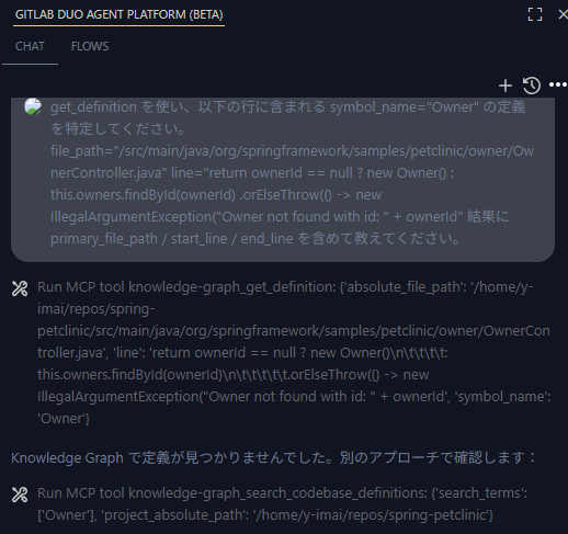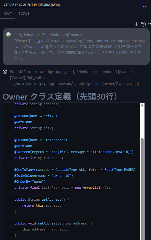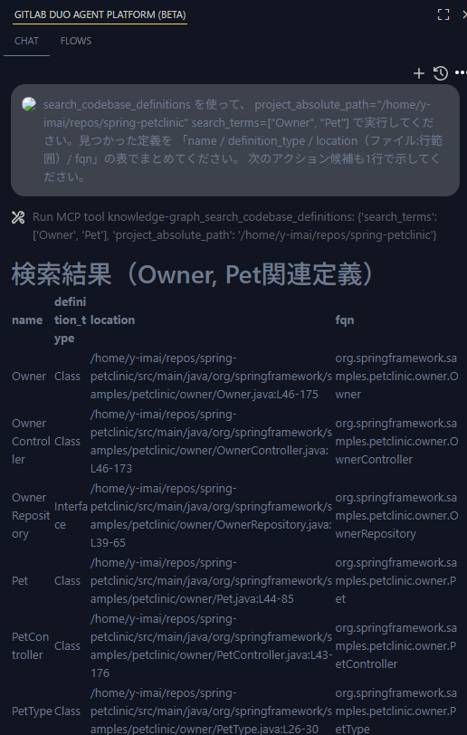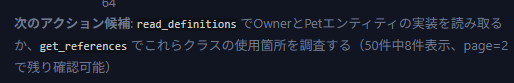 が実行され、検索結果(Owner, Pet 関連定義)の要約が返されました。さらに、次のアクション候補として、read_definitions