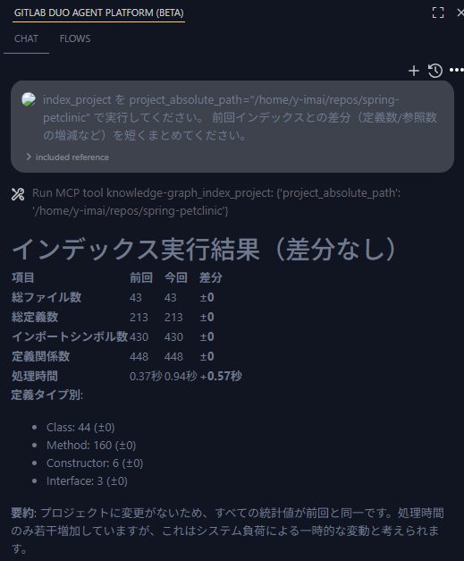 プロジェクトに変更がなかったため、インデックス実行結果は「差分なし」となり、Class、Method、Constructor、Interface の定義数が前回と同一であることを示す統計値(例: Class: 44 (±0))が返されました。