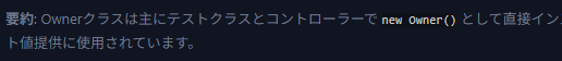 など、複数のテストクラスやコントローラーが検出され、「Ownerクラスは主にテストクラスとコントローラーでnew Owner()として直接インスタンス化されており、テストデータ作成やデフォルト値提供に使用されています」という簡潔な要約が返されました。