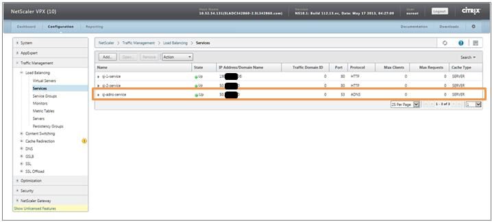 次は、Authoritative Domain Name Server(ADNS)を作成します([NetScaler > Traffic Management > Load Balancing > Services])。