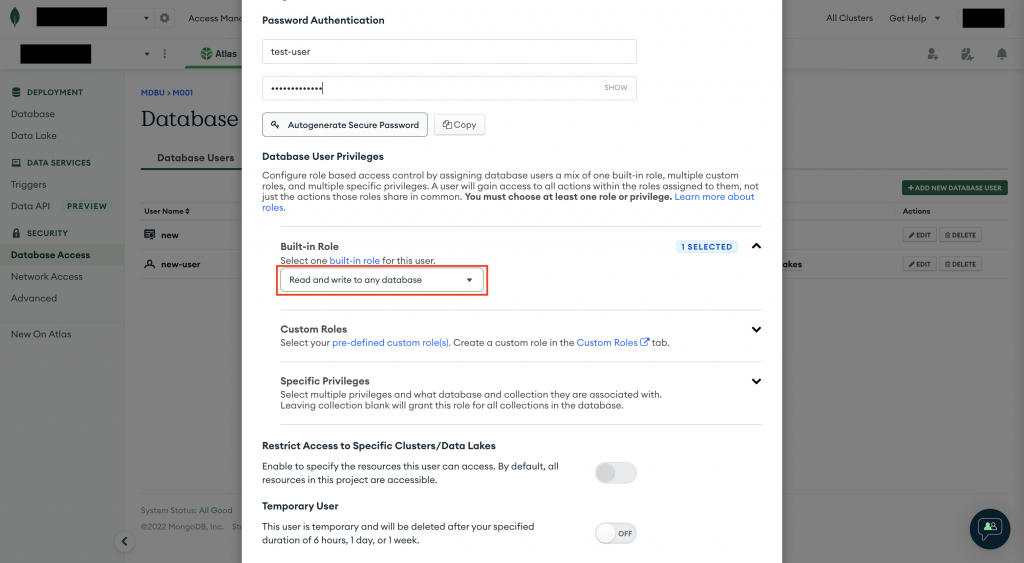 また、今回ユーザの権限は「Read and write to any database」にしました。Tableauと連携したいDBにはreadとwriteの権限を持たせましょう。