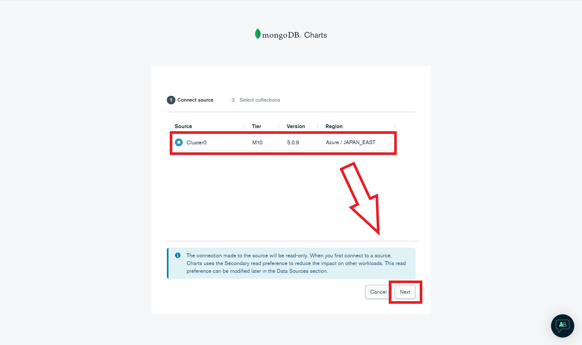 サンプルデータをロードしたClusterを選択し、[Next]を押下します。