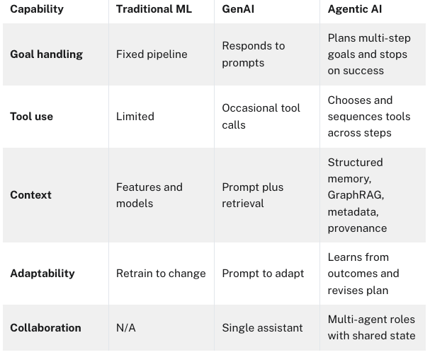 これにより、エンドツーエンドで実行されるランブック、その根拠を証明できるエージェント、そして書き換えなしに単一のエージェントから小さなチームへと移行する道が開かれます。この道のりを念頭に置くと、従来のML、生成AI、そしてエージェント型AIの違いが具体的かつ検証可能なものになります。