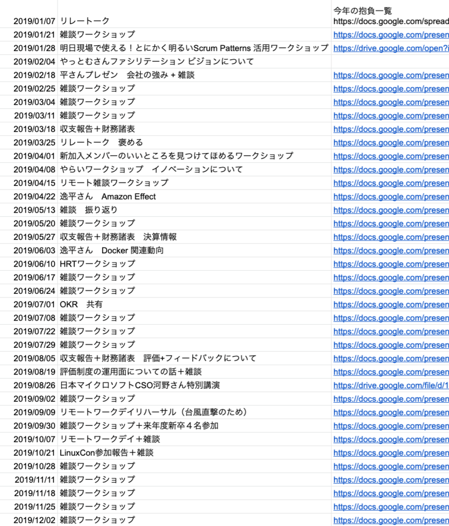 これは、月曜日10:00~11:00に全メンバーが集まって情報共有したりワークショップをやったりするチームビルディングのための時間です。