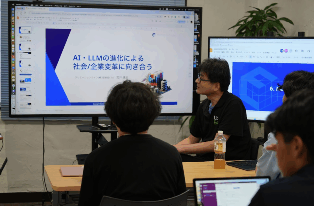 インターンの終盤では、CTOの荒井さんから「AI・LLMの進化による社会/変革に向き合う」のテーマで講義を実施しました。 AI駆動開発の最前線で活躍する荒井さんならではの視点から語られました。