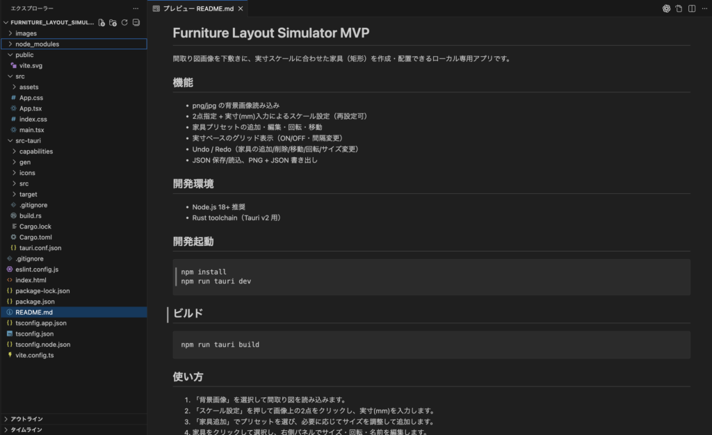 目的は「間取り図画像を下敷きに、実寸スケールに合わせた家具(矩形)を作成・配置できるアプリ」のMVPを作ることです。
