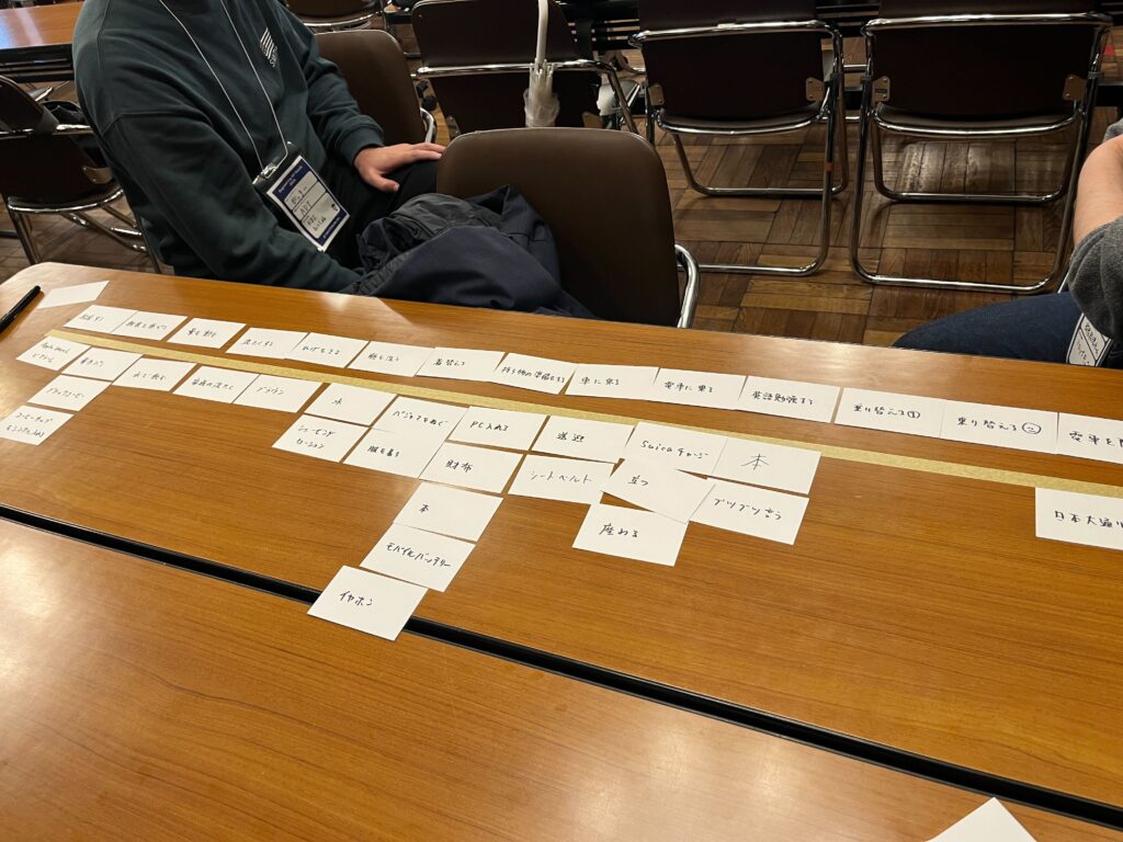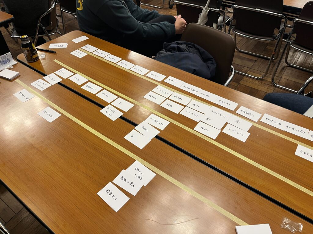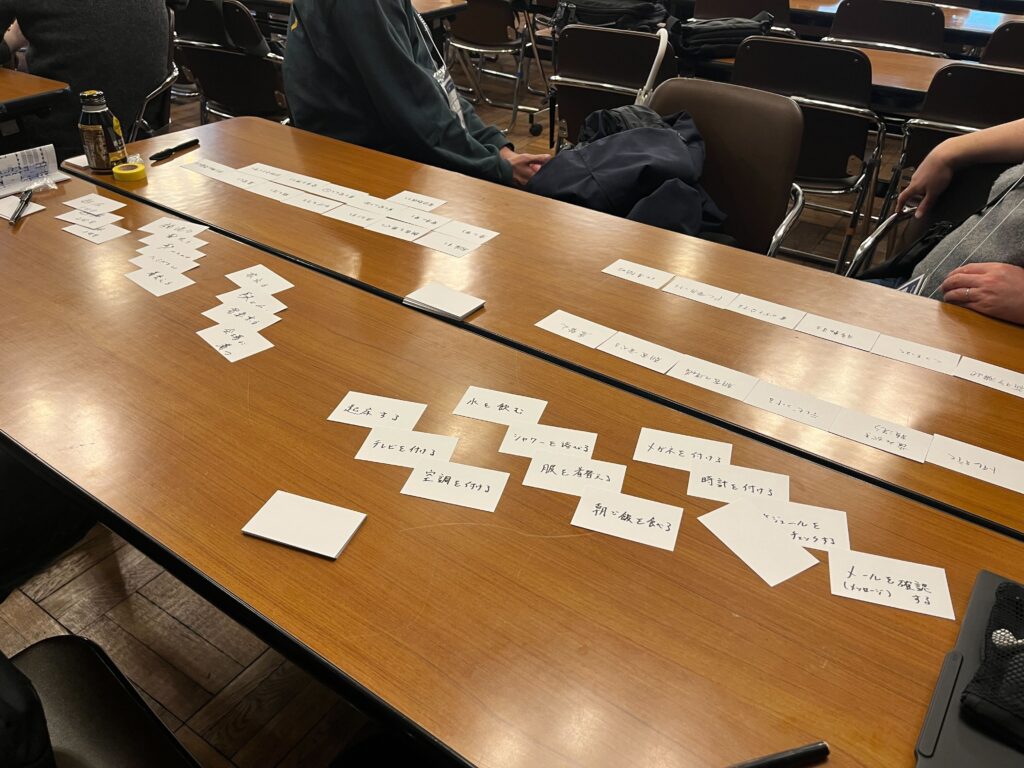 まずは各自が自分の朝の行動を付箋に書き出し、左から右へ時系列に並べます(ナラティブフロー)。 「顔を洗う」「コーヒーを淹れる」「メールをチェックする」……。 これらをグルーピングして「朝の準備」といった大きな枠組み(背骨)を作っていきます。