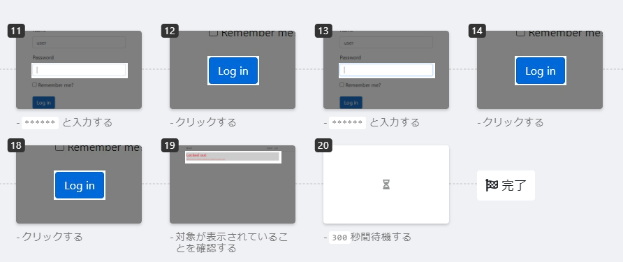 上記の操作で「パスワード認証に5回失敗するとアカウントがロックされる」までのテストシナリオが作成されました。全てのステップを一覧表示できます。